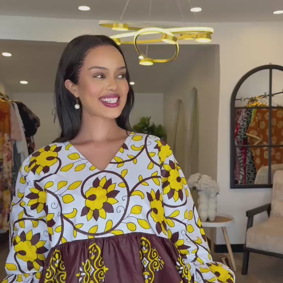 Step out in style with this stunning kanga-inspired mini dress! Designed with vibrant African prints, this dress features a flattering V-neckline, puff sleeves with ruffle details, and a playful A-line silhouette.
