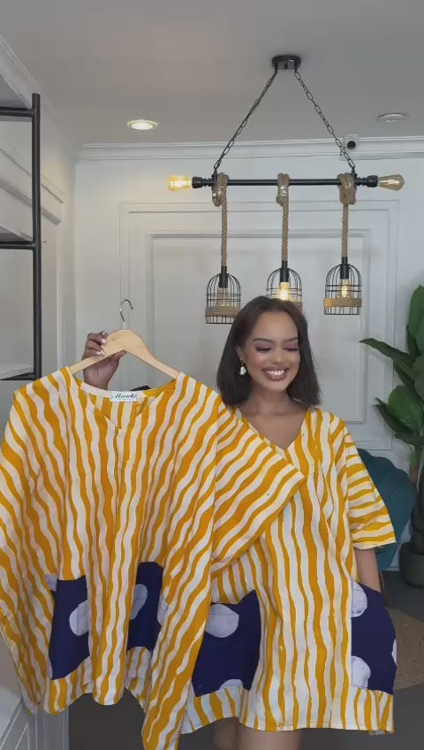 With its relaxed fit, flattering V-neckline, and roomy batwing sleeves, this dress blends casual chic with a touch of Afro-boho charm. It can be worn as a short dress for petite ladies or styled as a tunic over leggings or shorts.